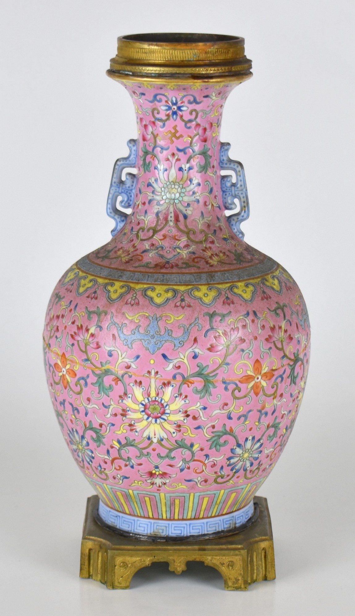 Cina vaso in porcellana con fondo rosa montato a bronzo