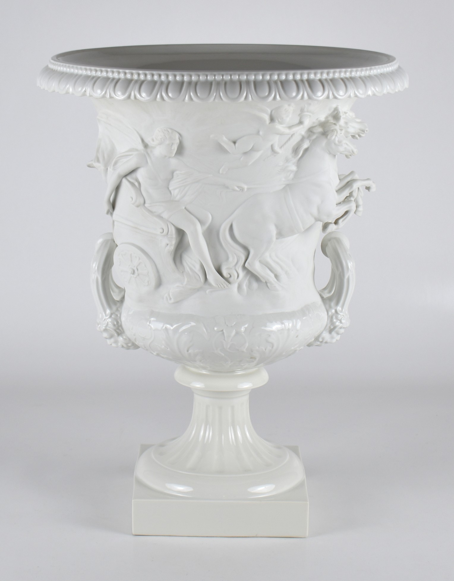 grande vaso biansato in porcellana smaltata e bisquit decorato ad alto rilievo