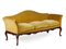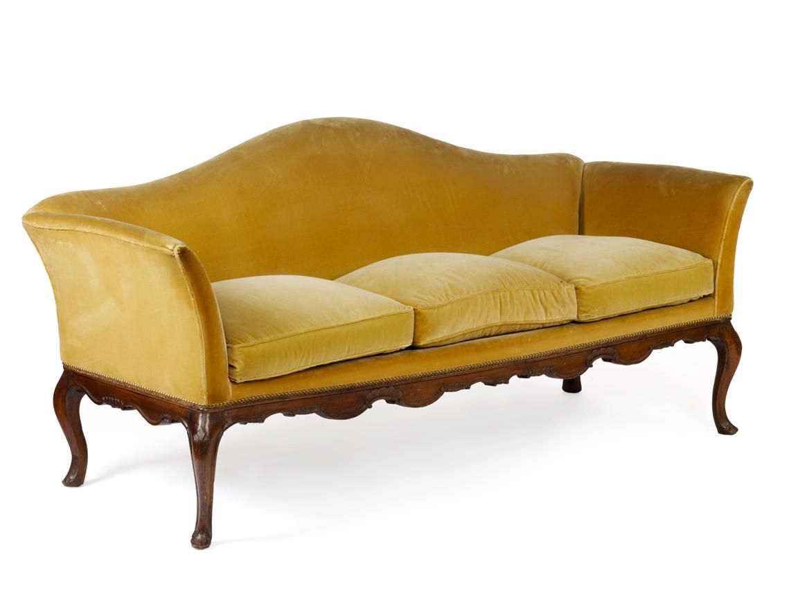 in noce, fascia intagliata e gambe di linea mossa, ricoperto in velluto giallo, lungh. cm 188