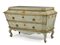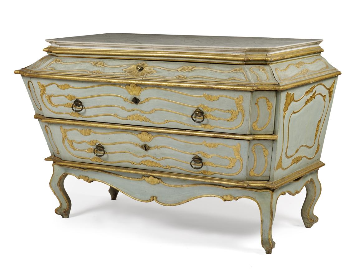 in legno laccato e dorato, piano in marmo bianco, fronte spezzato a tre cassetti e gambe mosse su piedi a ricciolo, cm 86x138x66