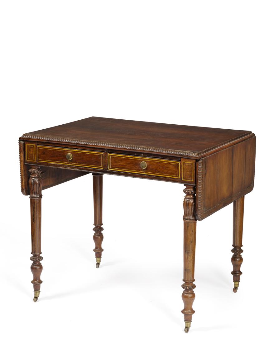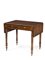 in mogano, piano rettangolare con alette, bordo baccellato, due cassetti sotto al piano, gambe tornite calzate da rotelle, cm 80x102x58