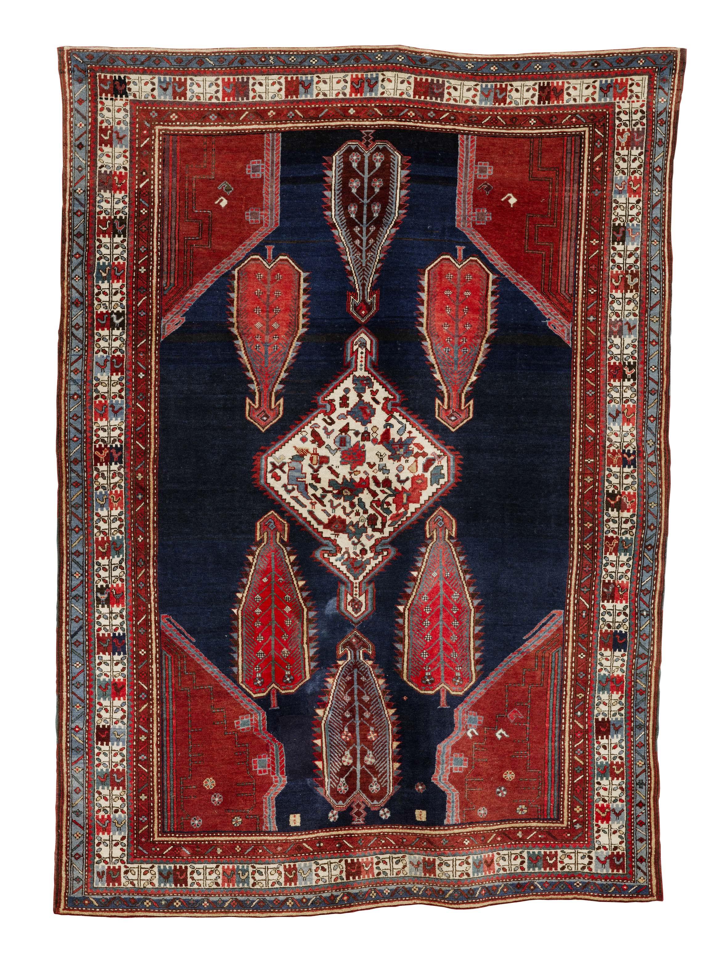 TAPPETO KARABAG, INIZI SECOLO XXfondo blu con decori e cantonali rossi, al...