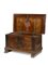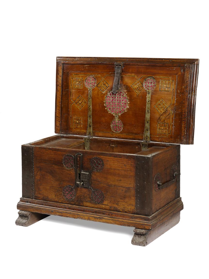 in noce, piano rettangolare arricchito all’interno da pannello intarsiato con applicazioni in metallo; serratura e maniglie sui fianchi in ferro battuto, base modanata, piedi intagliati a motivi vegetali, cm 45x85x44, restauri