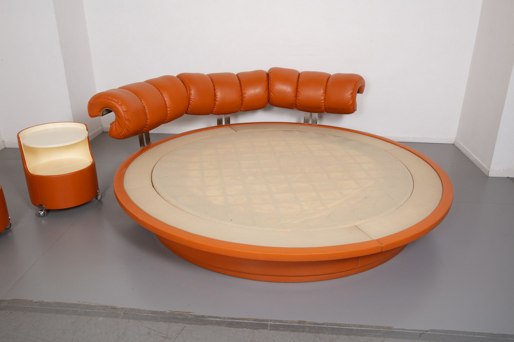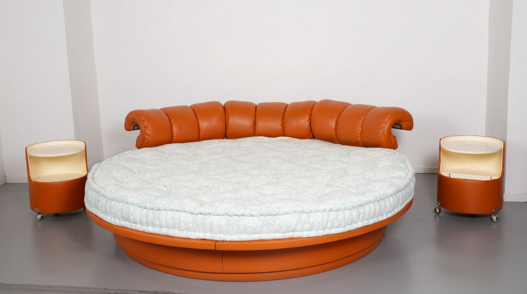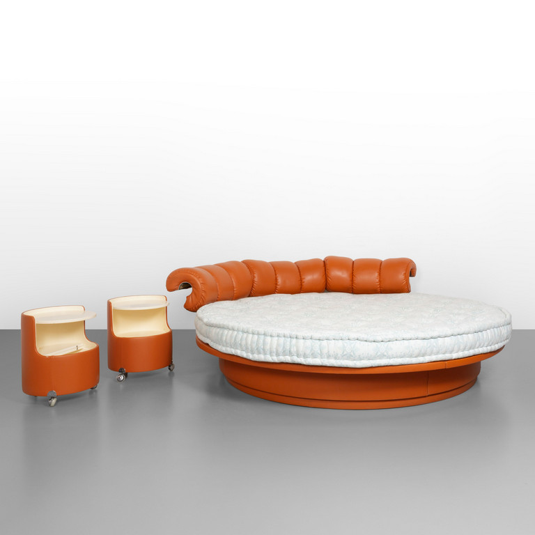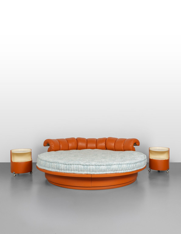 Decron padding and leather upholstery. Manufacturer's label. Bedside tables: laquered wood with leather detailing Manufactured' labels.