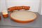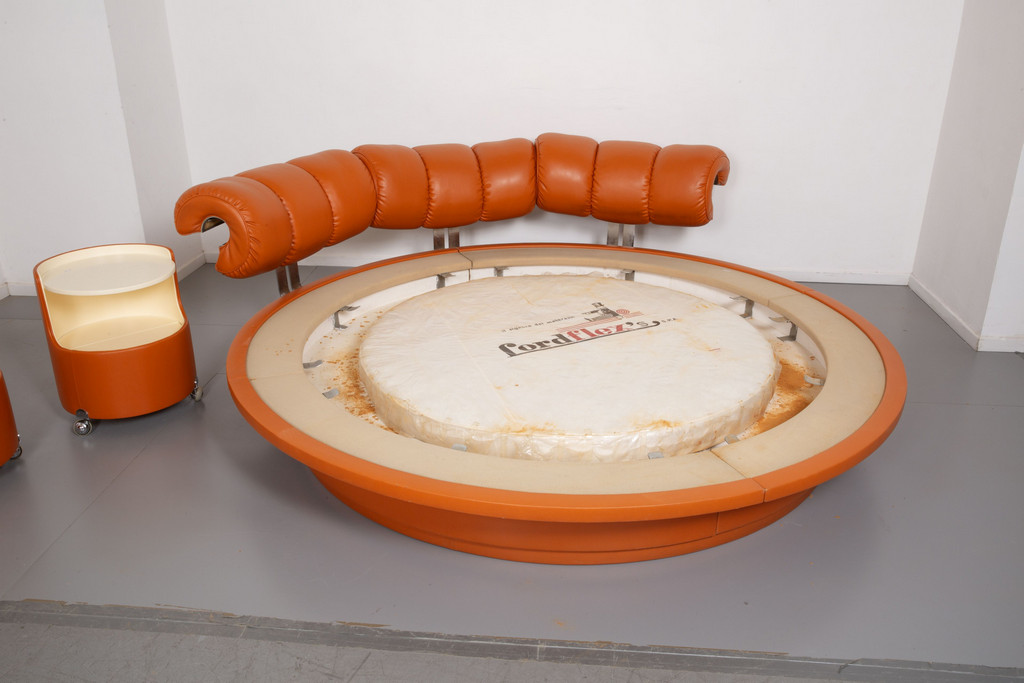 A bed with a swivel bent-beech base and matching