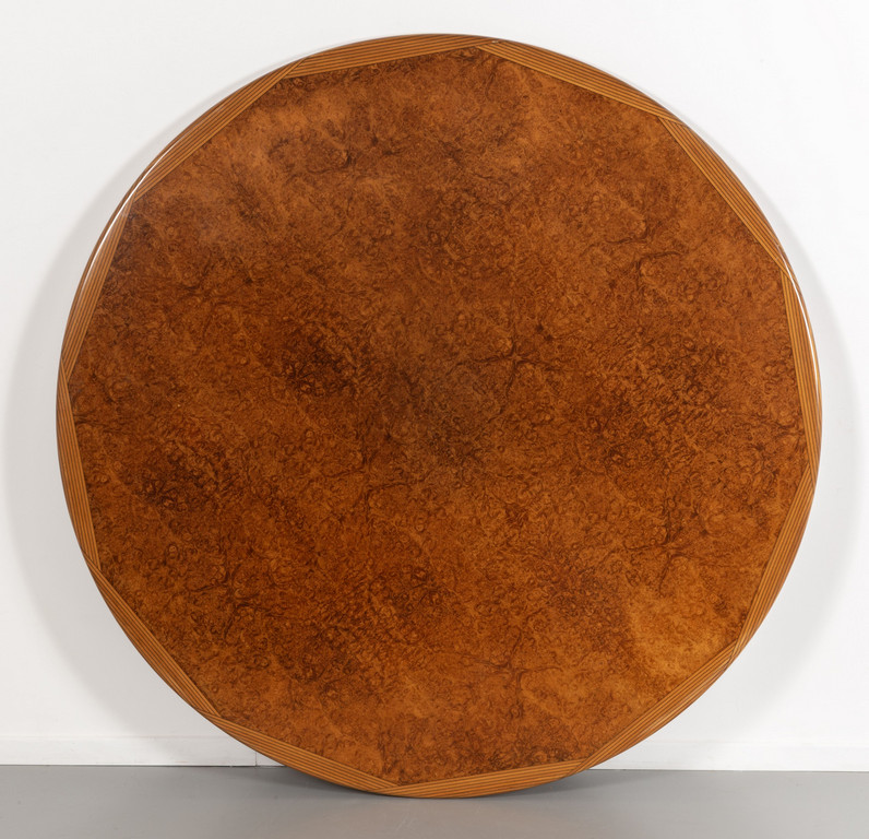 Base in legno di noce piano in radica di tuia con bordo stratificato in diverse essenze.
