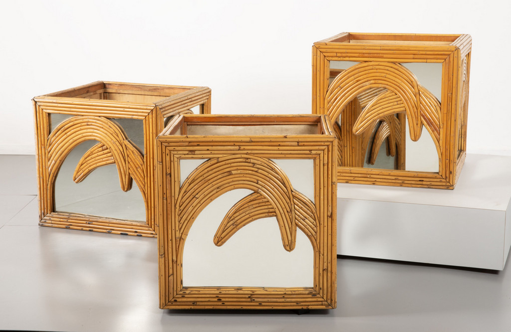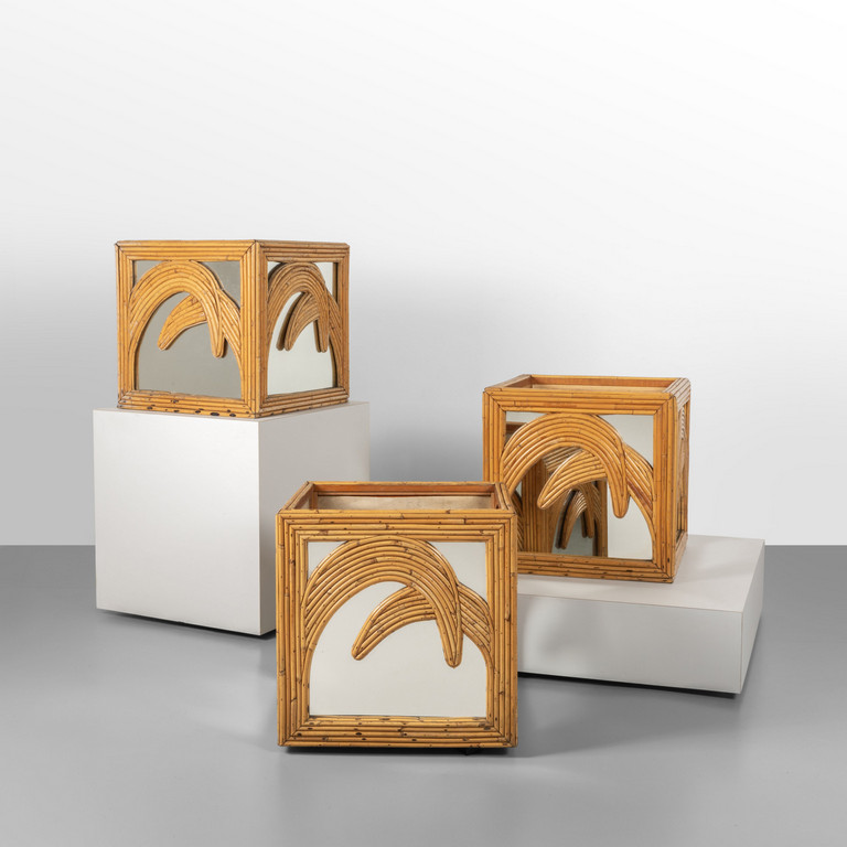 Strutture in legno rivestite in giunco e cristallo argentato.