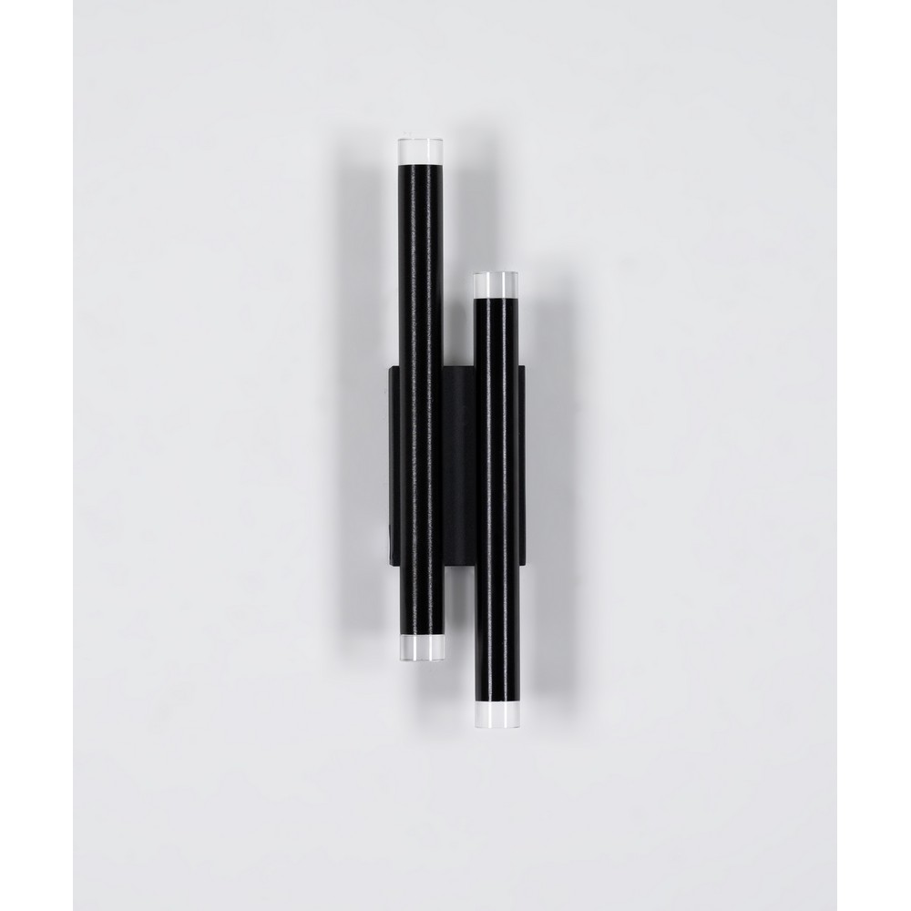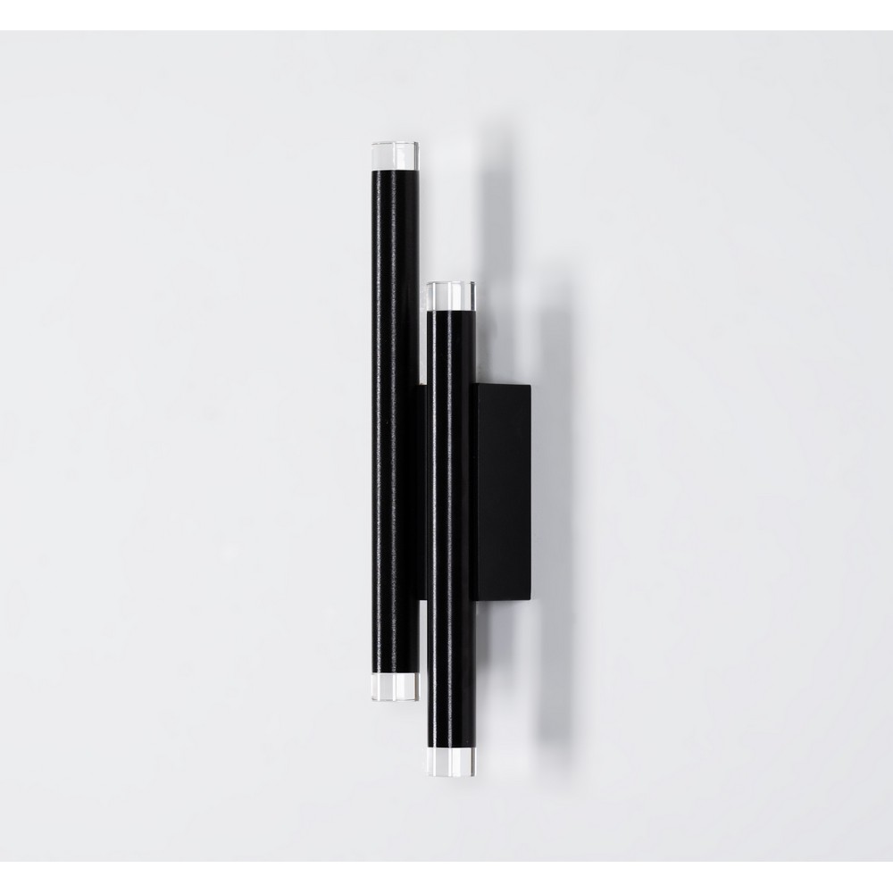 Lampada da parete a quattro luci, diffusori tubolari in metallo verniciato nero con terminali in plexiglass trasparente.