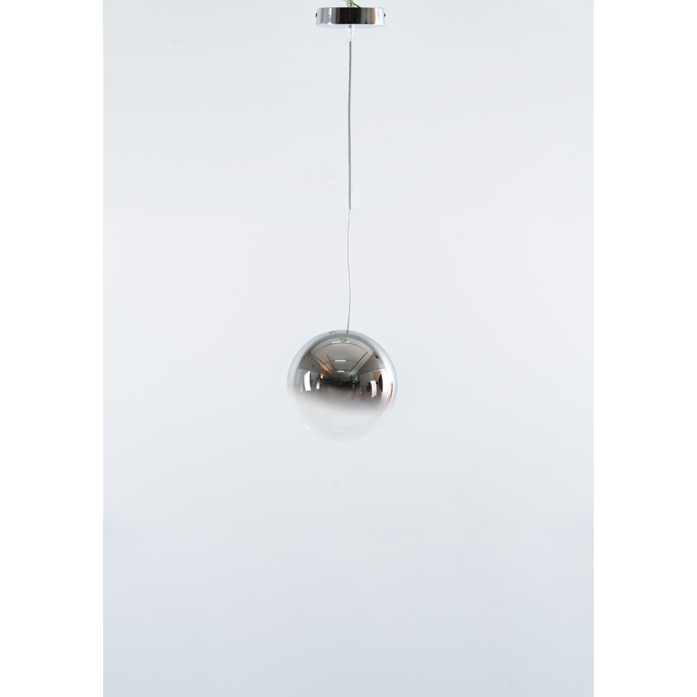 Lampada a sospensione ad una luce, diffusore globulare in vetro parzialmente specchiato, base a soffitto in metallo cromato.