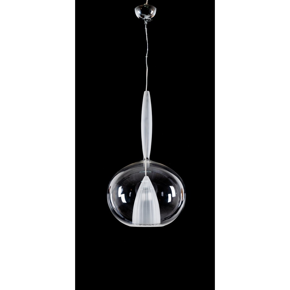 Lampada a sospensione ad una luce, diffusore globulare in vetro trasparente incolore, cavità conica in vetro satinato, sostegno ellittico, coppa semisferica in acciaio cromato.