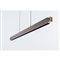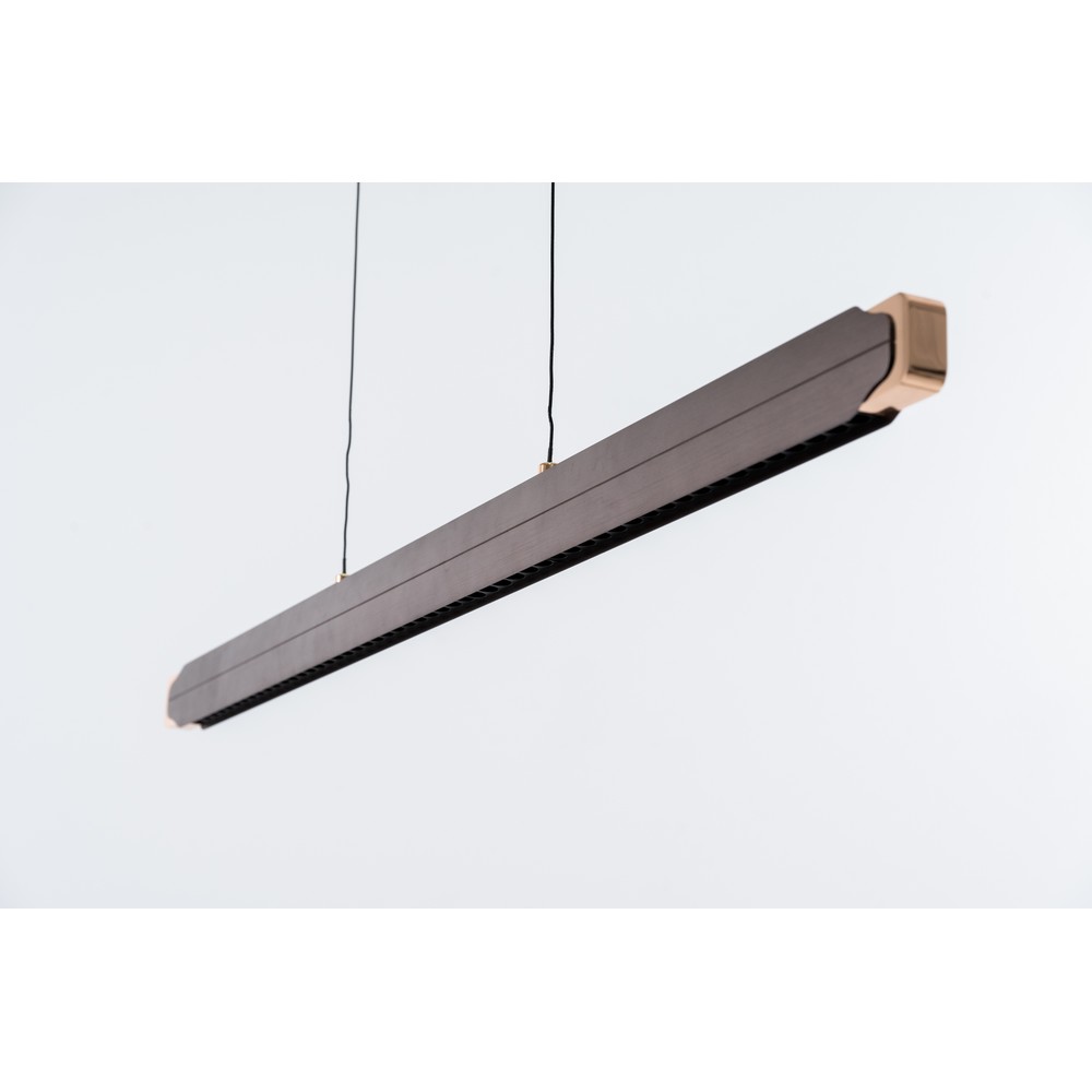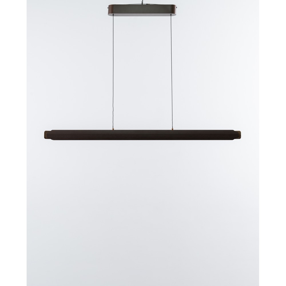 Lampada a sospensione ad una luce con diffusore a lama sospesa, finitura noce canaletto, cavi in acciaio, coppa a soffitto ovalizzata in metallo.