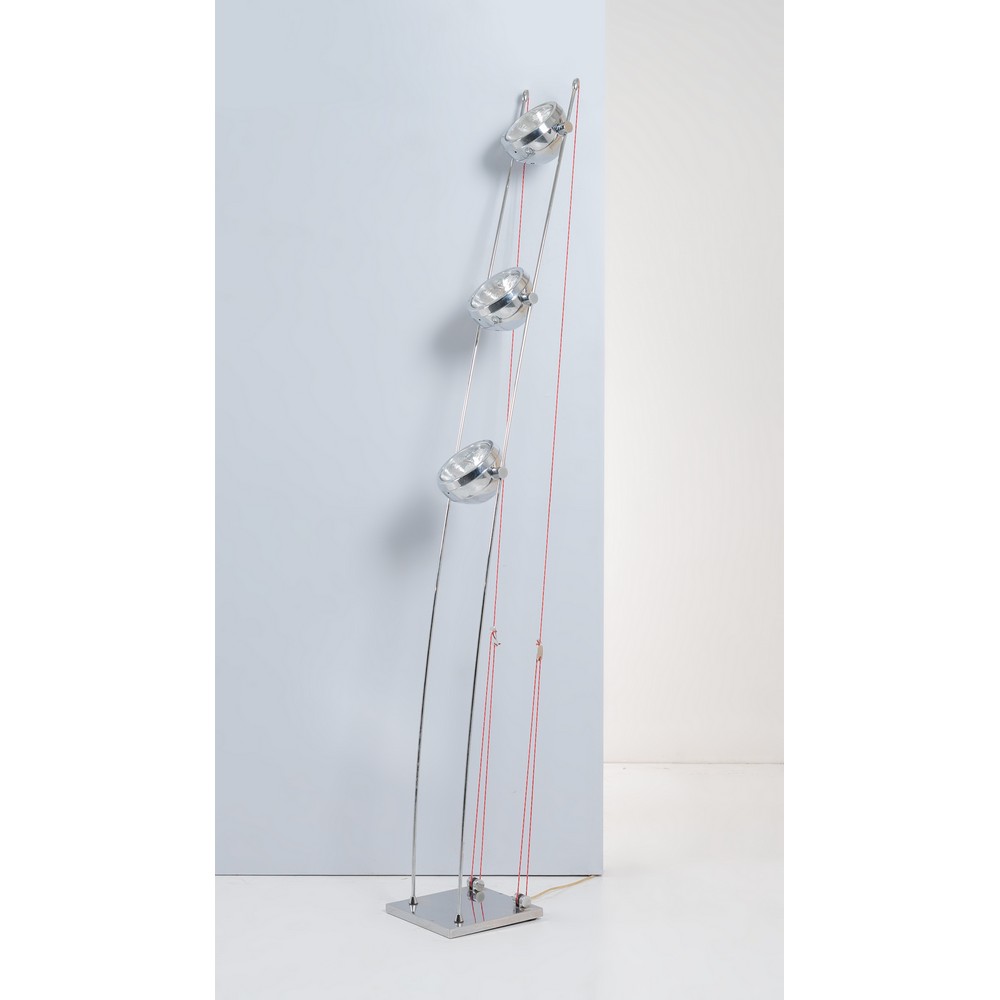 Lampada da terra a tre luci, struttura tenzo tesa in acciaio cromato e cavi rossi, diffusori orientabili in metallo cromato, base quadrata.