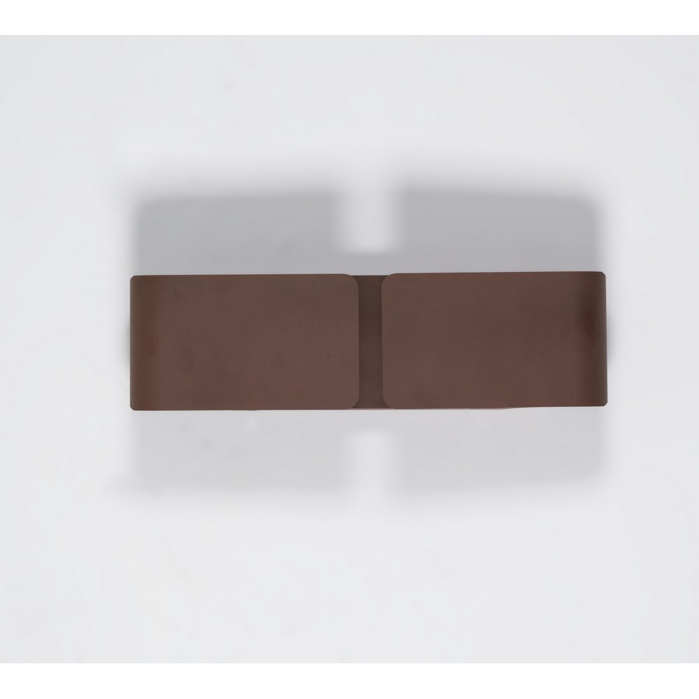 Lampada da parete a due luci, struttura in metallo verniciato effetto corten, diffusore con corpo ovalizzato composto da due lame metalliche curvate.