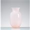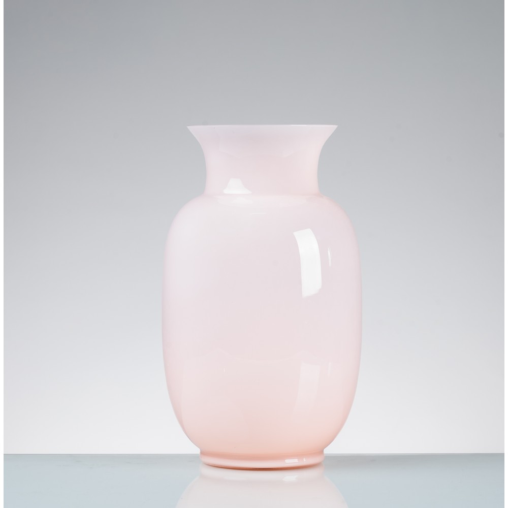 Vaso in vetro rosa opalino, corpo ovalizzato con collo a vaso e bocca circolare piana. Firma a graffio ed etichetta di produzione.