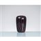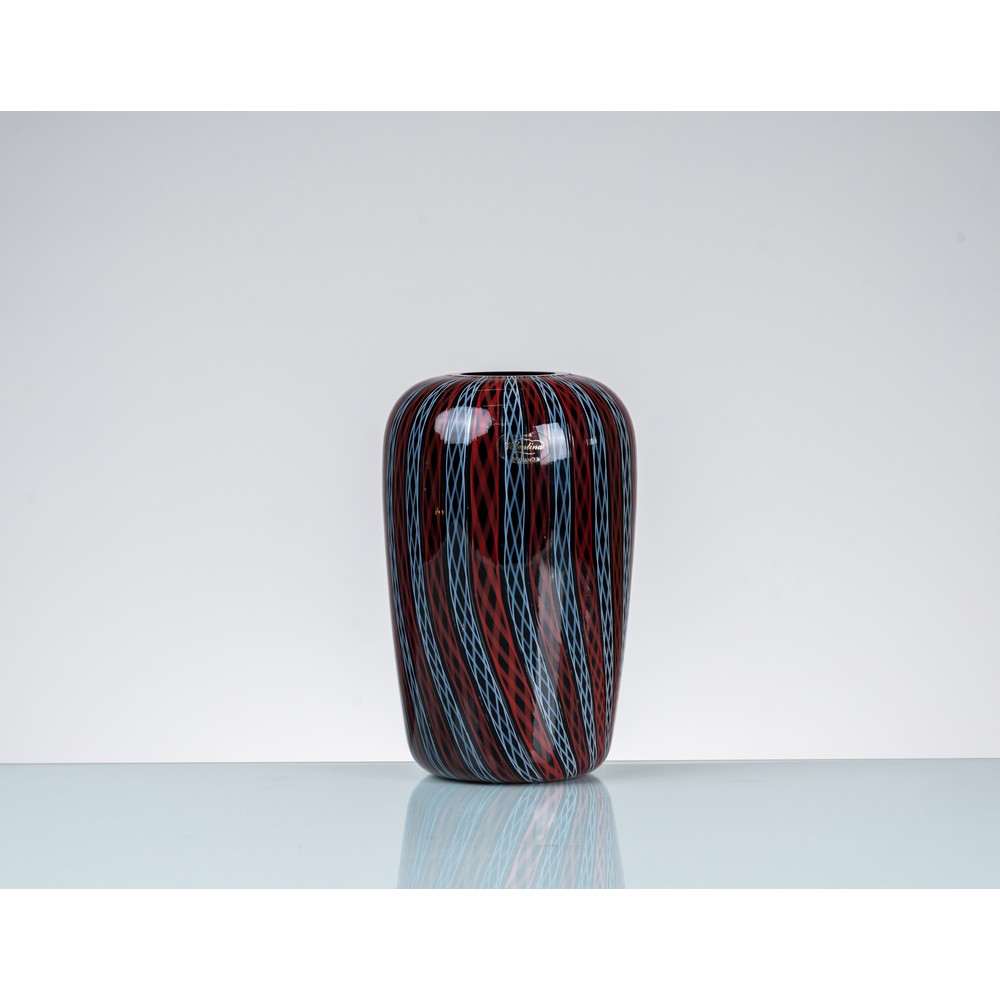 Vaso in vetro nero con decoro zanfirico lattimo e rosso, corpo ovalizzato con bocca piana circolare. Firma a graffio.