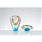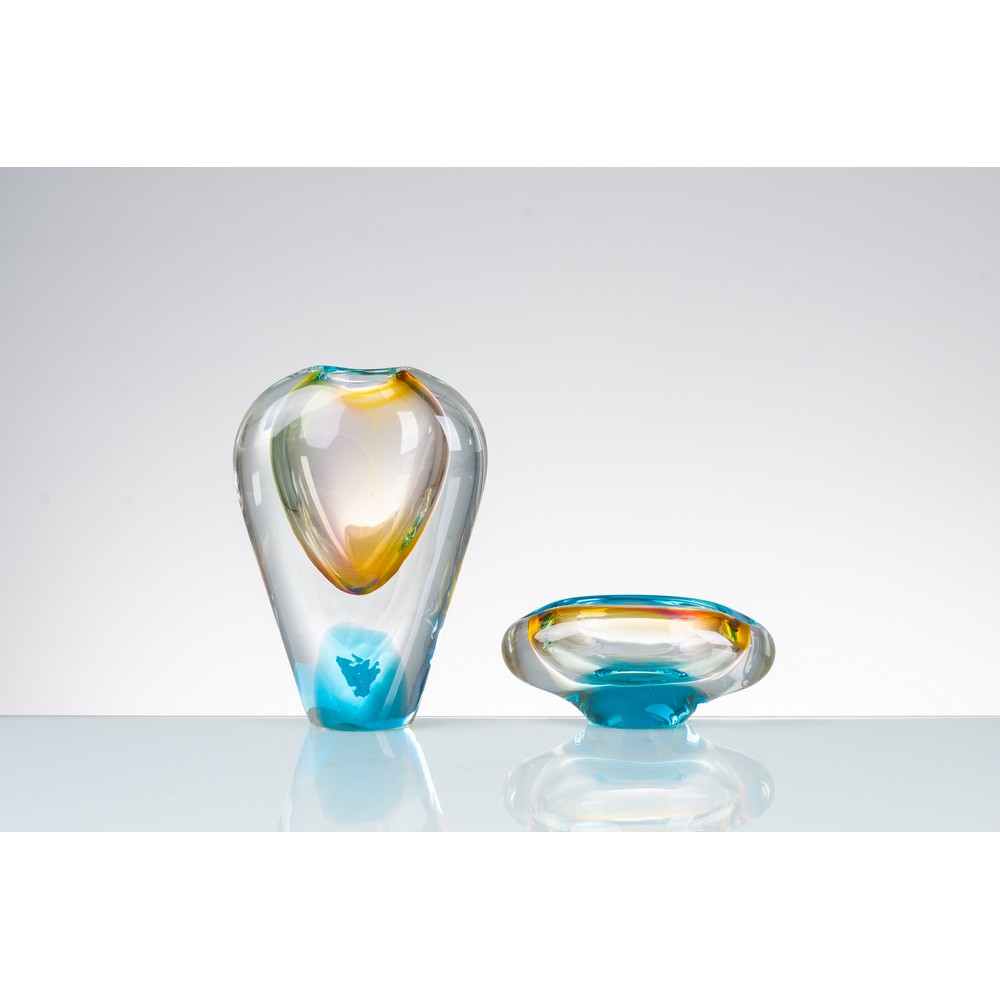 Un vaso ed un posacenere in vetro sommerso celeste, giallo ed incolore. Vaso con corpo a goccia su base quadrata con bocca piana circolare; posacenere con corpo ovalizzato e fianchi curvati.