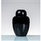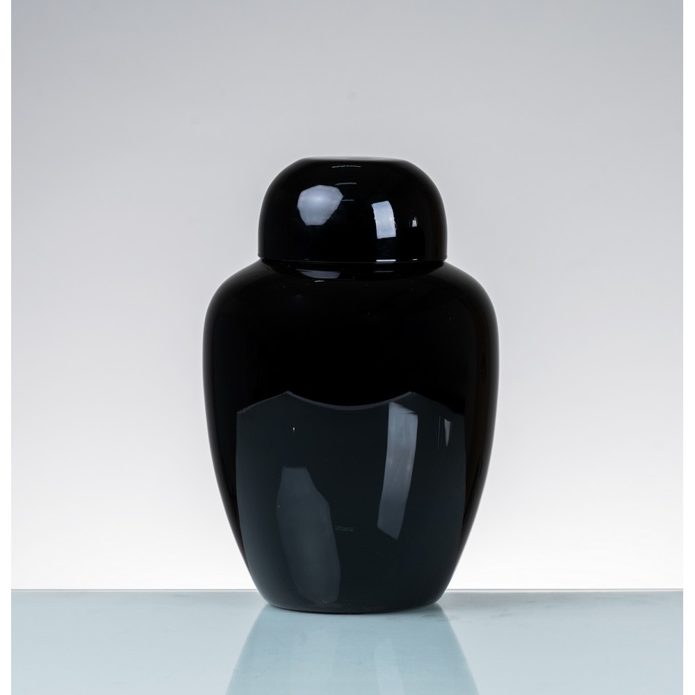 Potiche in vetro nero con coperchio, corpo ovalizzato con largo collo cilindrico, coperchio semisferico.