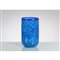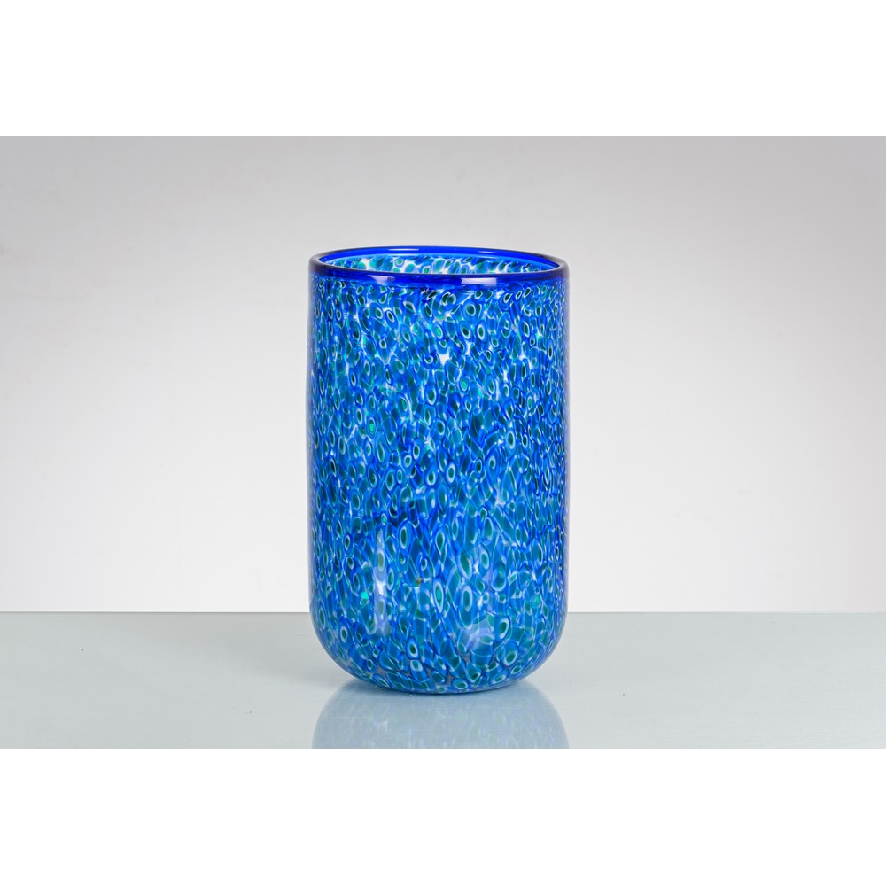 Vaso in vetro soffiato decorato con murrine blu, verdi e bianche, corpo cilindrico con bocca piana circolare. Firma a graffio.