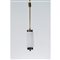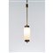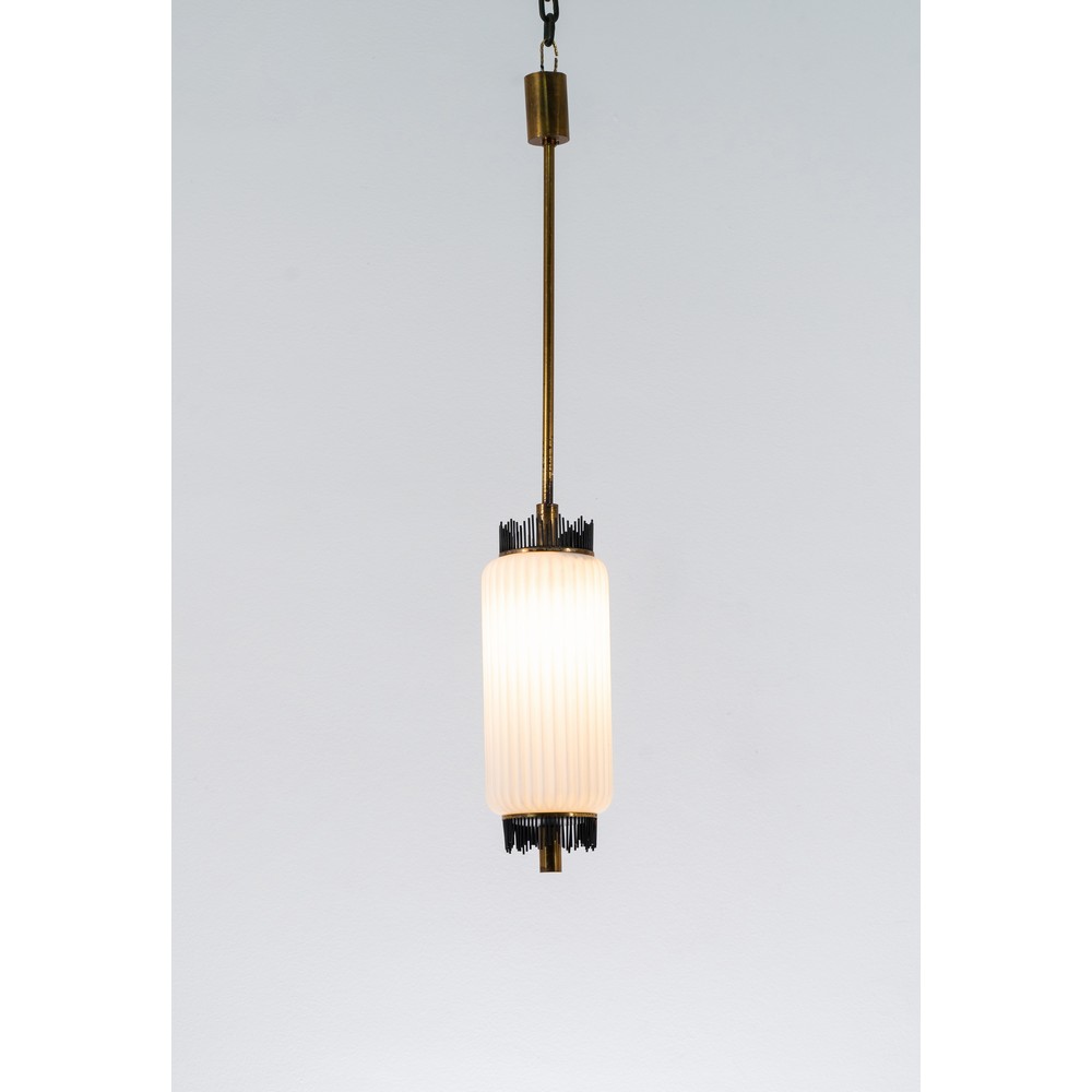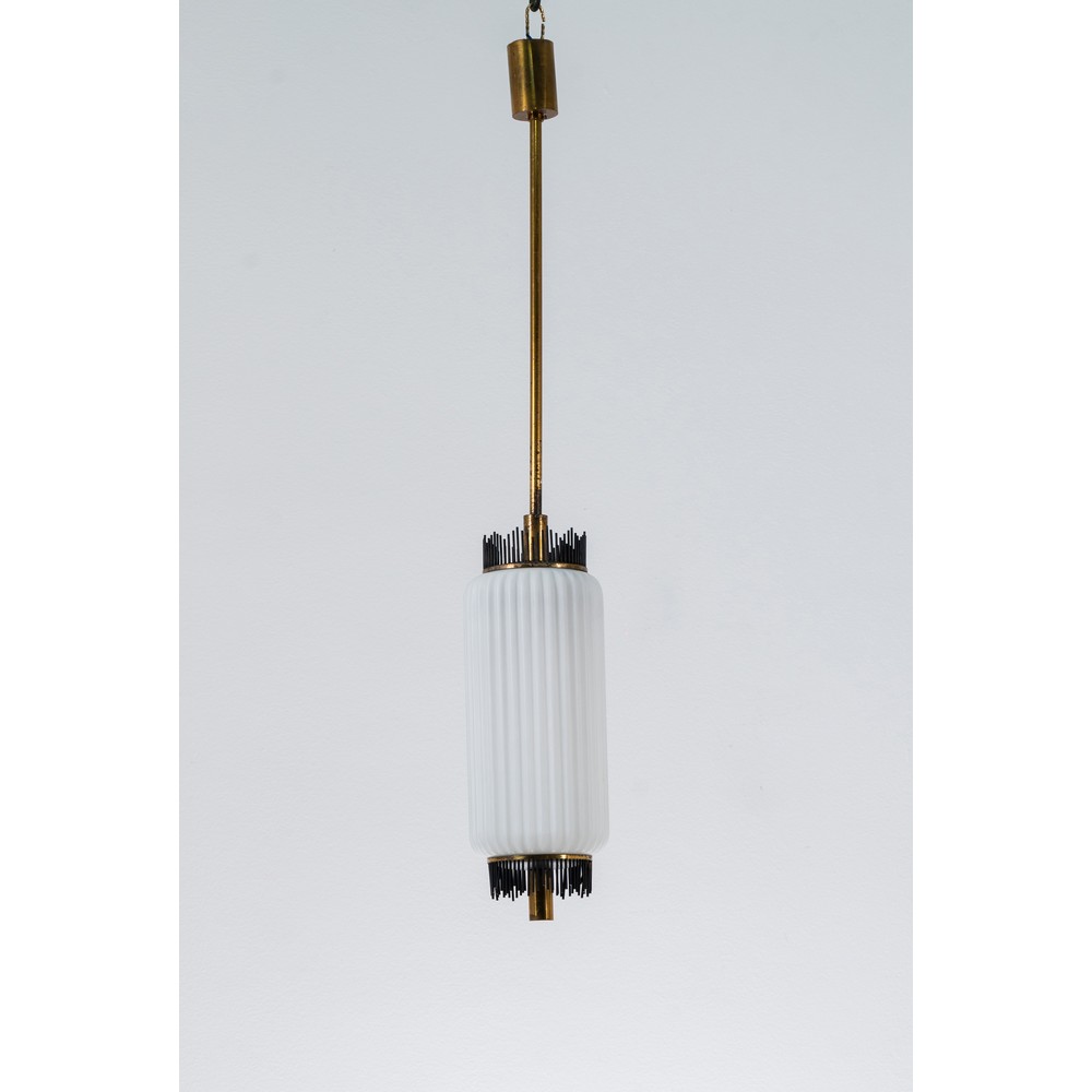 Lampada a sospensione ad una luce, struttura in ottone e metallo verniciato nero, diffusore cilindrico in vetro opalino satinato.