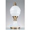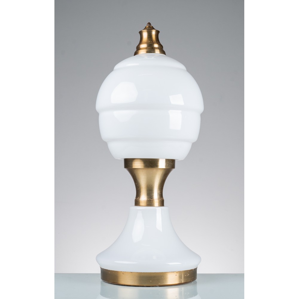 Lampada da tavolo ad una luce, struttura in metallo cromato e vetro lattimo, diffusore globulare a stampo.
