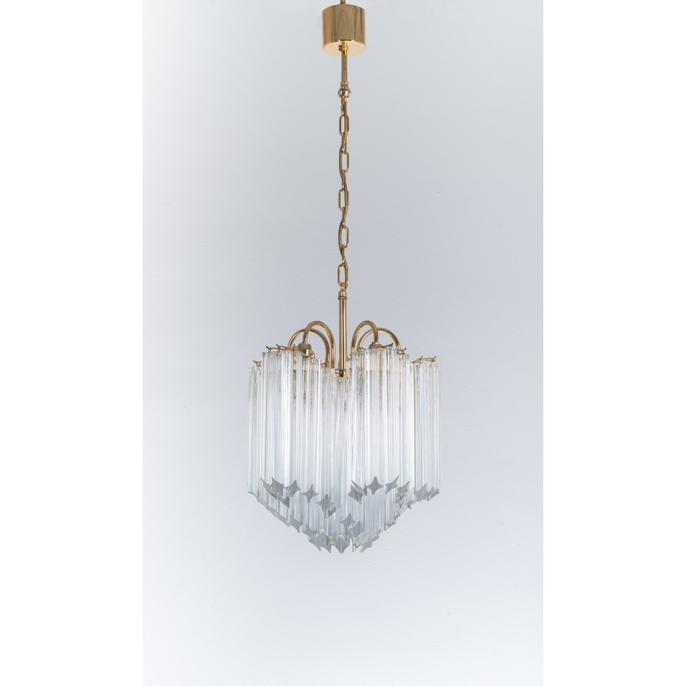 Lampada a sospensione a sei luci luci, struttura in metallo dorato, diffusore composto da elementi trieri in cristallo incolore trasparente.