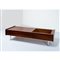 Tavolo da salotto in legno esotico, piano rettangolare con vano contenitore in metallo, piedi conici in metallo cromato. Lievi difetti.
