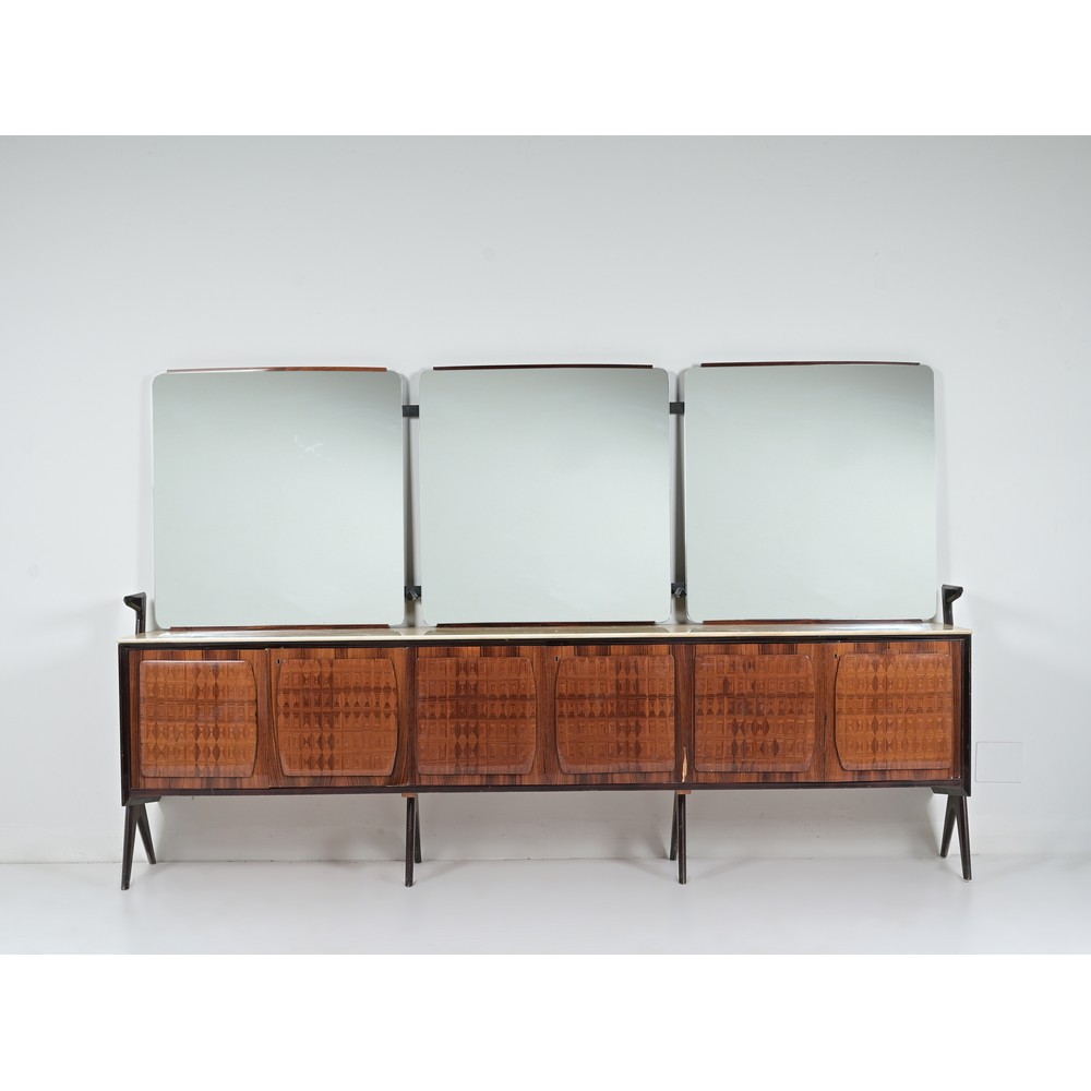 Sideboard in legno esotico e legno ebanizzato, sul fronte tre vani con ripiano chiusi da tre coppie di ante battenti decorate con tarsie geometriche, piano in marmo, tre specchi sovrastanti con sostegni reggi mensola sospesi. Qualche mancanza all’impiallacciatura, mensola sospesa mancante.