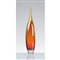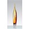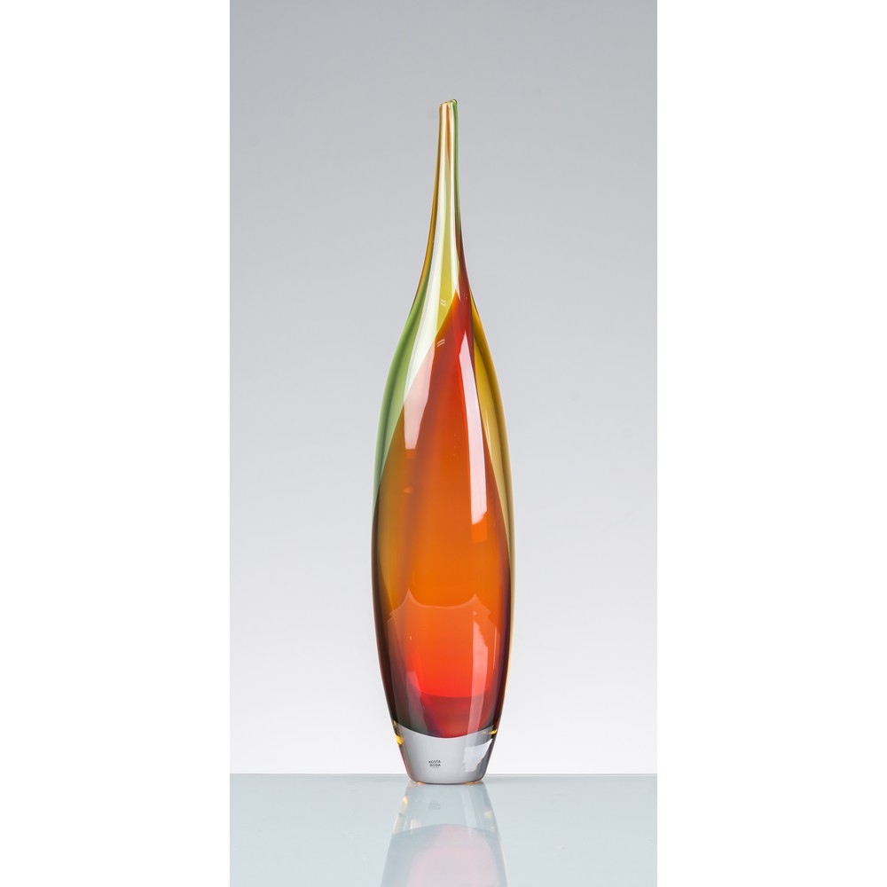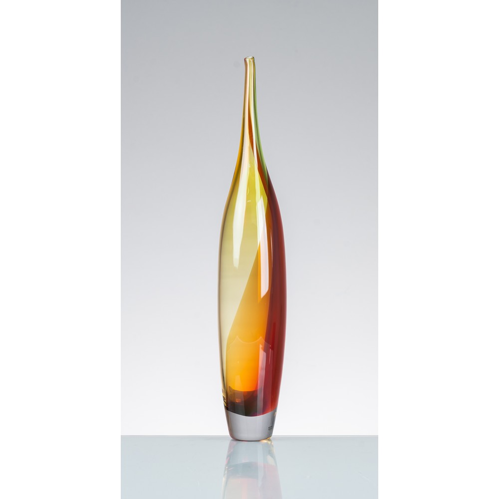 Vaso in vetro sommerso incolore, rosso e verde, corpo ovalizzato a bottiglia, con lungo e stretto collo, bocca circolare. Firma a graffio ed etichetta di produzione.