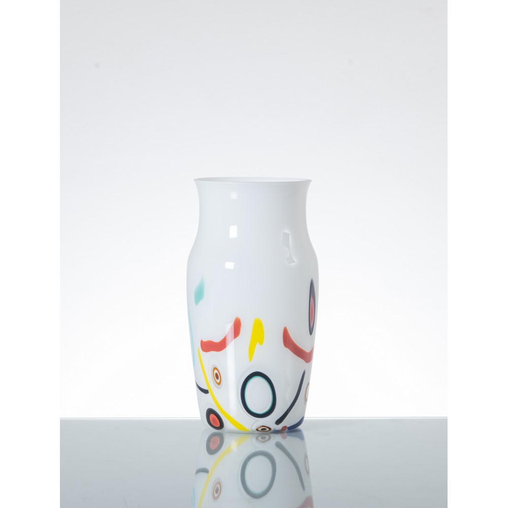 Vaso in vetro soffiato lattimo con inclusione di frammenti di canne e murrine policrome, corpo cilindrico lievemente sagomato sul collo, bocca circolare piana. Firma incisa a punta: VeArt Venezia.