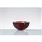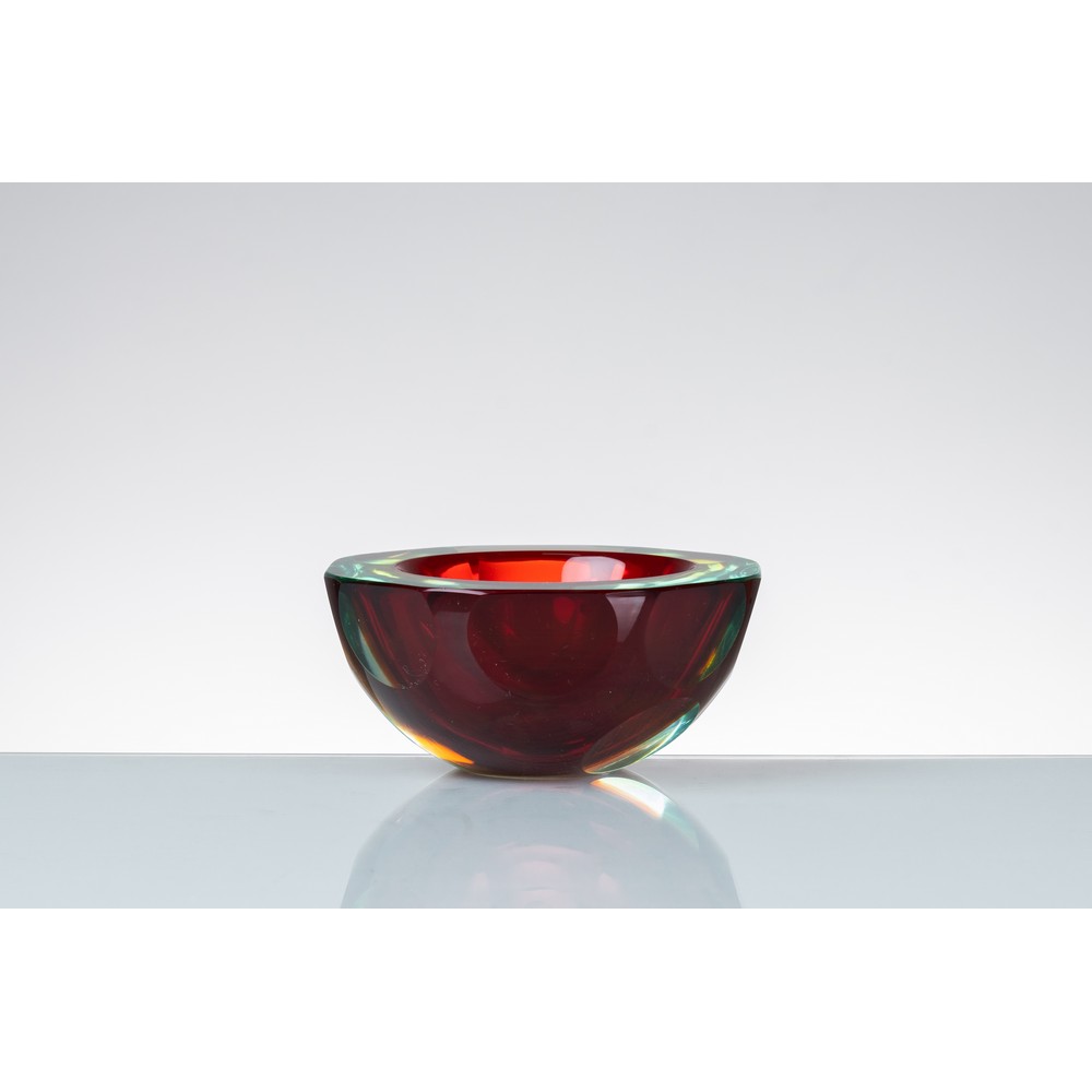 Svuota tasche in vetro sommerso verde e rosso, corpo semisferico con sfaccettature laterali, bocca circolare con bordo sagomato.