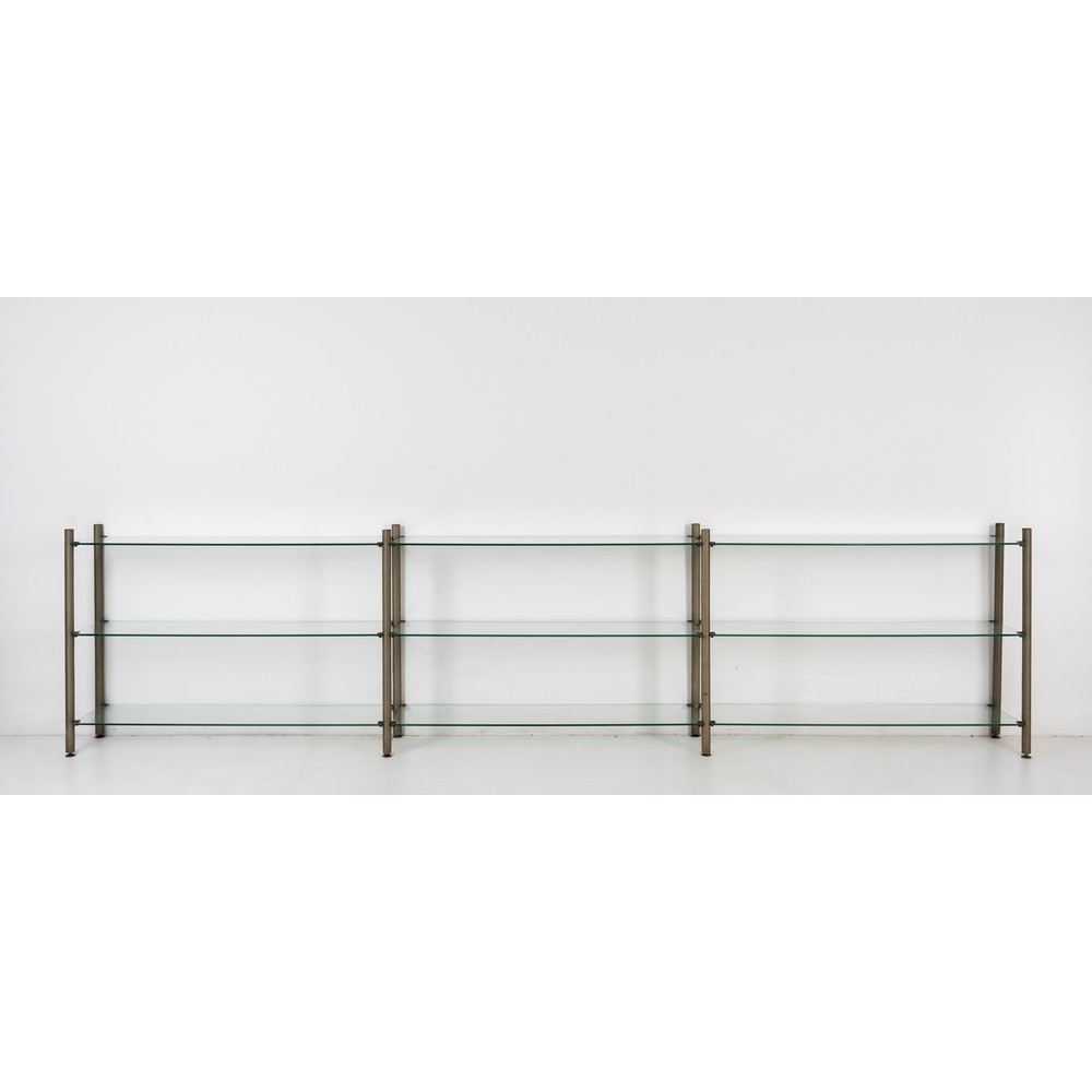 Libreria bassa con struttura in legno rivestita in seta, piani rettangolari in cristallo di grosso spessore, minuterie in metallo. Difetti, sbeccature e tracce di tarlo morto.