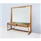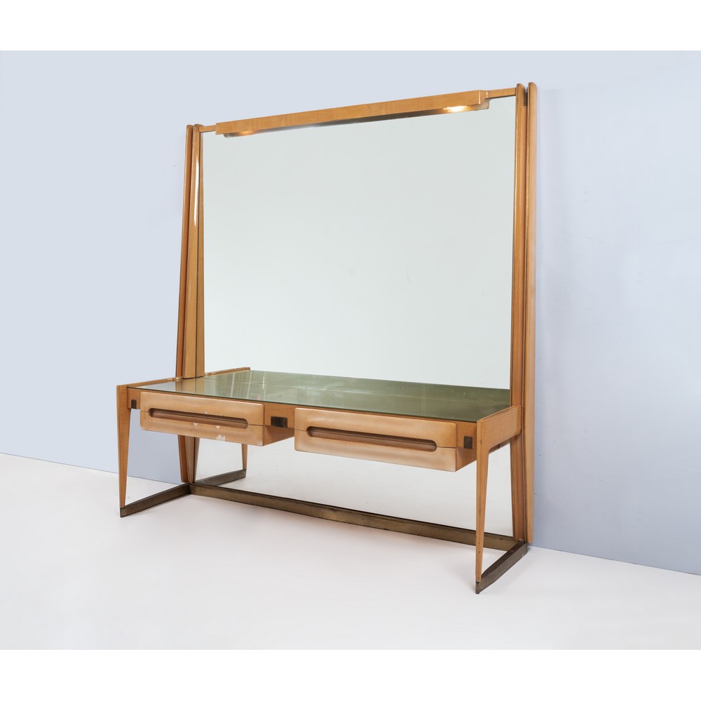 Mobile toletta con struttura in ottone e legno di faggio, sul fronte quattro cassetti, piano in vetro, cristallo specchiato, luce incassata. Usure e piccole mancanze.