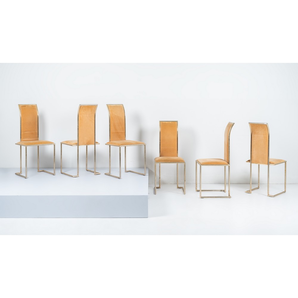 Sei sedie con struttura in ottone, spalliera e seduta con imbottitura e rivestimento in velluto beige. Segni di uso.