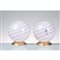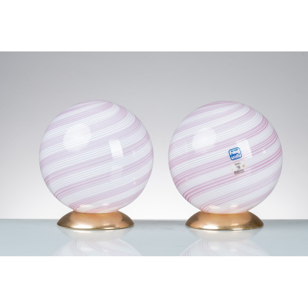 Coppia di lampade da tavolo ad una luce, struttura in metallo dorato con diffusore sferico in vetro decorato con canne rosa e lattime. Etichetta di produzione.