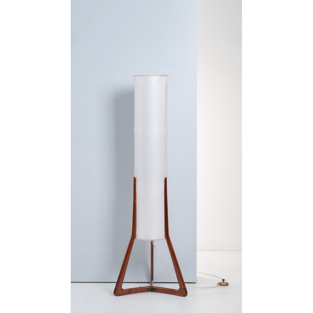 Lampada da terra a tre luci, struttura in legno di teak, piede tripode, diffusore cilindrico in tessuto bianco.
