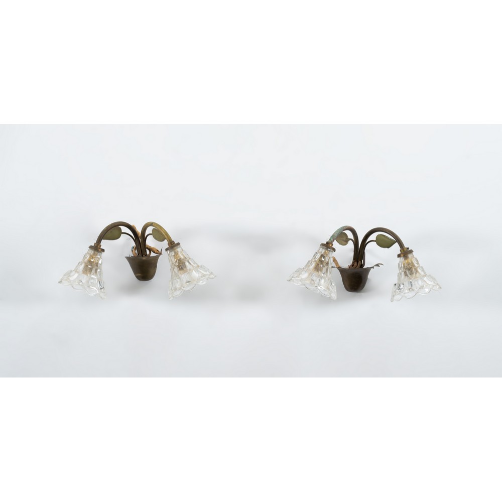 Coppia di lampade da parete a due luci, struttura in metallo dorato a motivo floreale, diffusore a campana con petali in vetro incolore. Segni di uso e parti ridipinte.