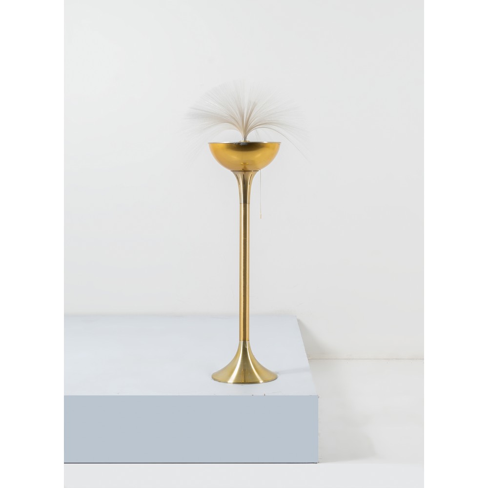Lampada da terra ad una luce, struttura in metallo dorato, diffusore composto da fascio semisferico di fibre ottiche