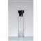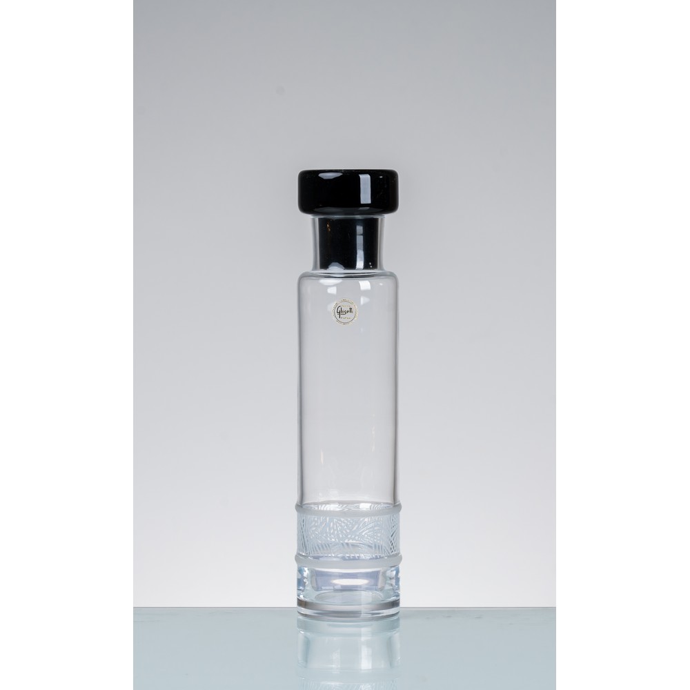 Bottiglia in vetro incolore, corpo cilindrico con decoro geometrico sulla fascia inferiore, tappo in vetro nero. Etichetta di produzione.