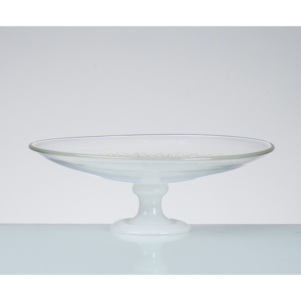 Alzata in vetro lattimo lievemente iridato, coppa circolare su sostegno sagomato.