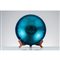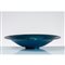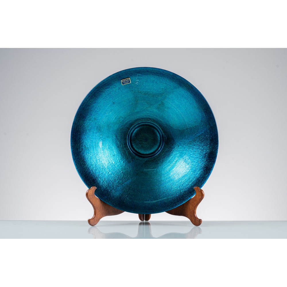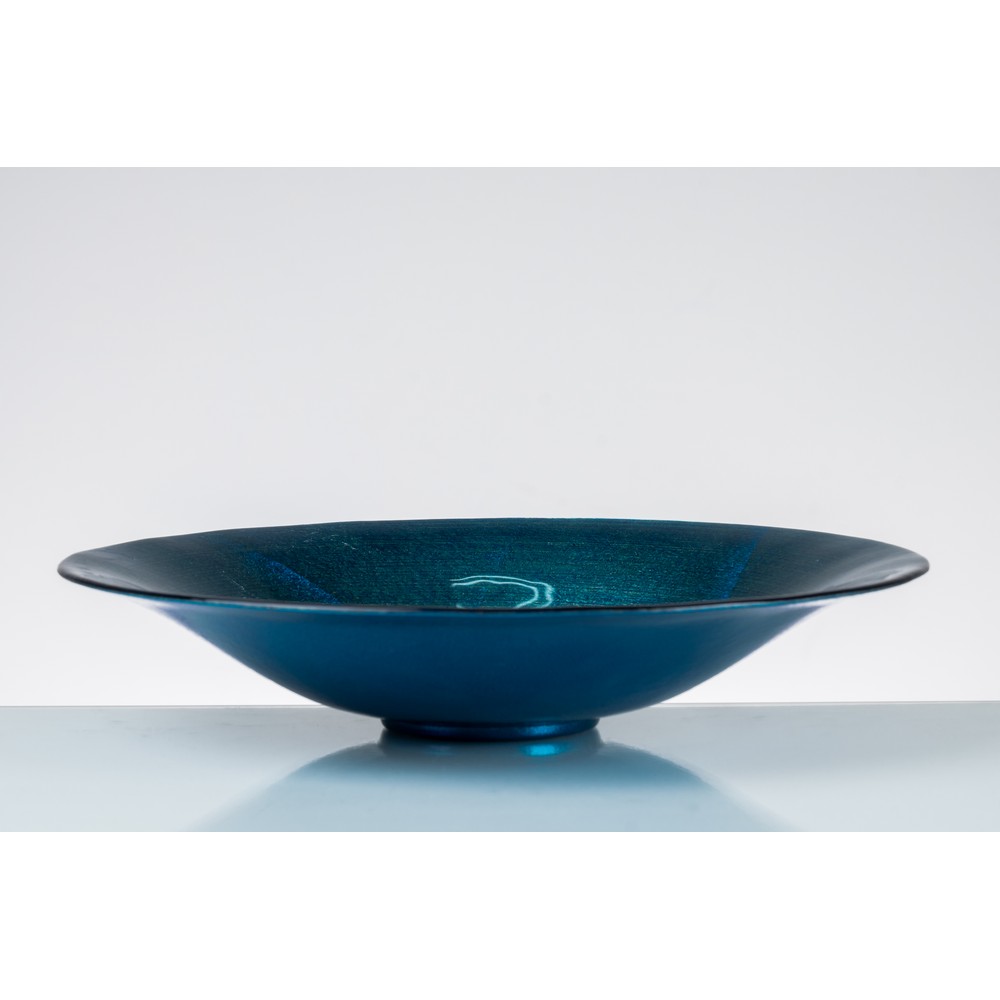 Centrotavola in vetro soffiato blu con lavorazione a righe sottili oro, corpo a piatto circolare. Etichetta di produzione ed etichette del venditore.