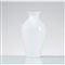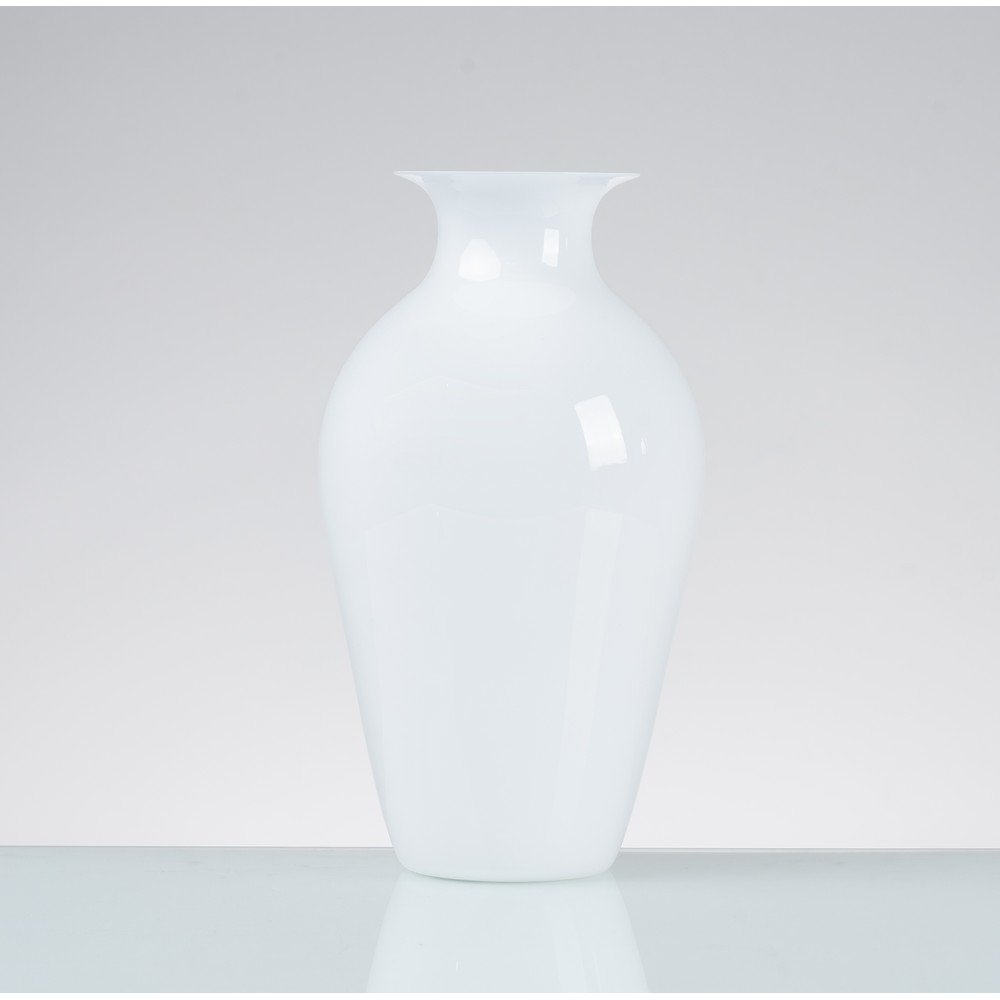 Vaso in vetro lattimo, corpo a goccia con basso collo, bocca circolare lievemente estroflessa.