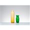 Un vaso in vetro incamiciato verde e lattimo, corpo ovalizzato con collo a vaso e bocca circolare, etichetta di produzione. Un vaso in vetro incamiciato giallo e lattimo, corpo cilindrico con basso collo e bimbo a circolare piana.