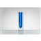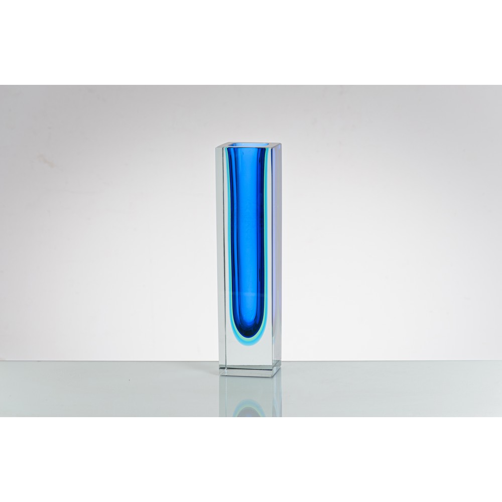 Vaso in vetro sommerso incolore, azzurro, verdino e blu, corpo a parallelepipedo con bocca quadrata piana.