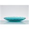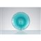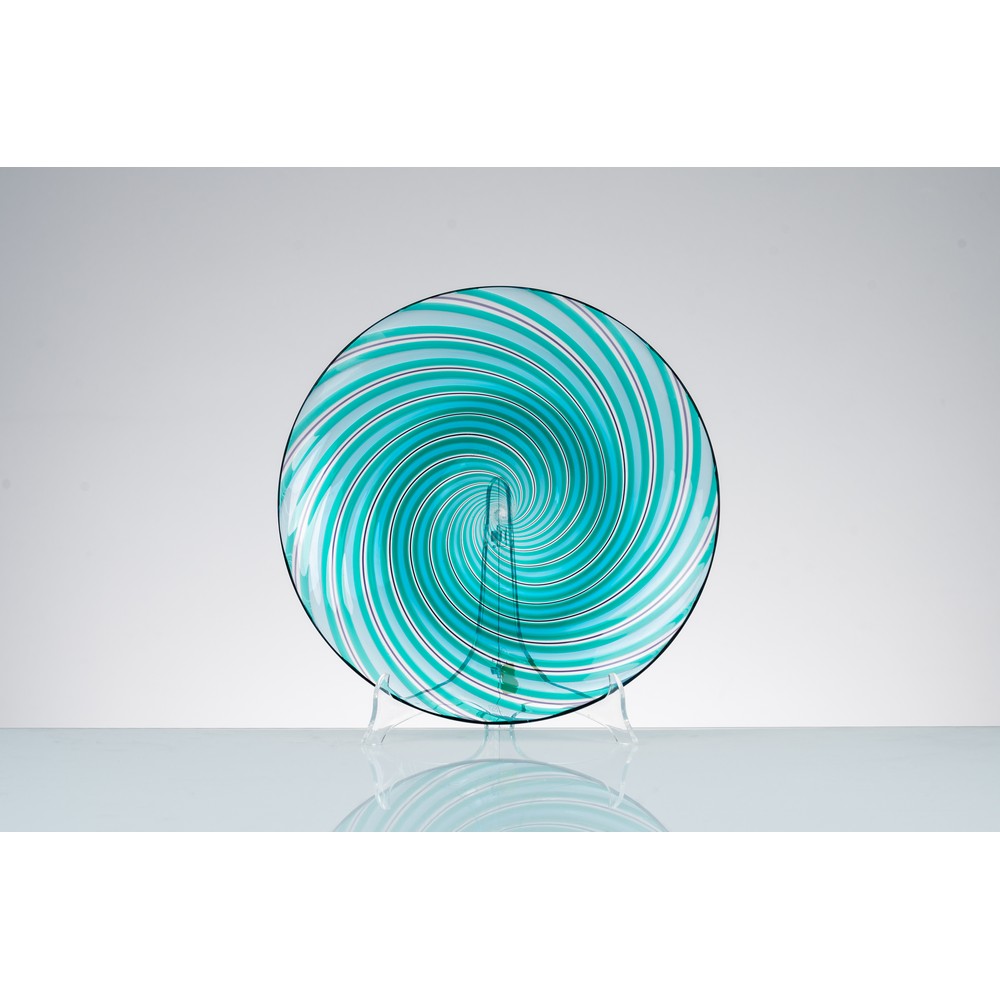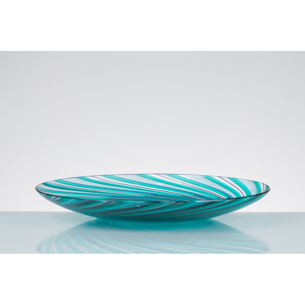 Centrotavola in vetro soffiato con lavorazione a canne verdi, celestine e seppia, corpo a piatto circolare. Firma a graffio.
