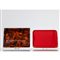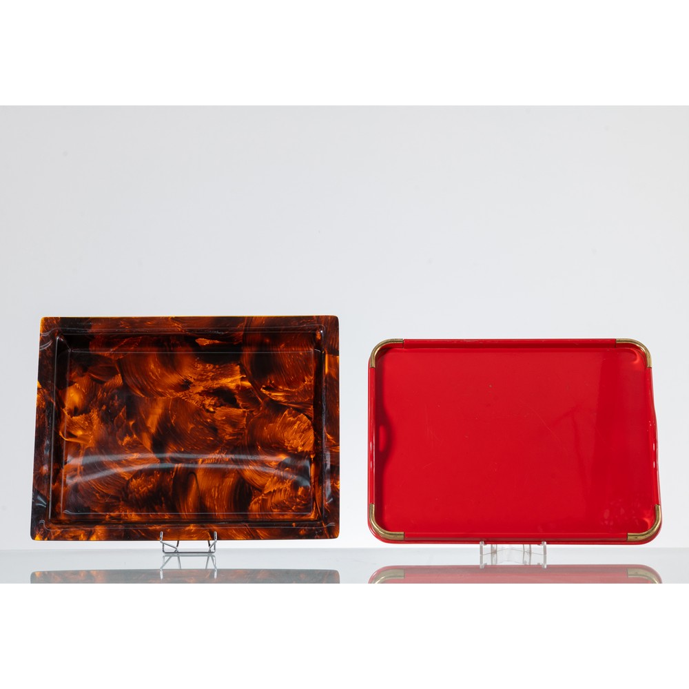 Due vassoi rettangolari, uno in lucite decorato a finta tartaruga, uno laccato in rosso con angoli in ottone. Segni di uso.
