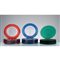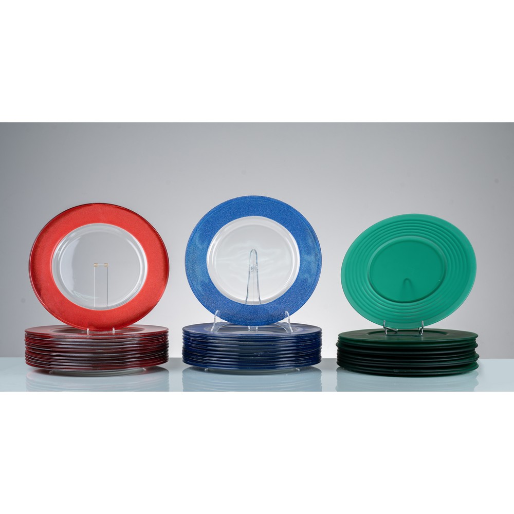 Trentasei sottopiatti circolari in vetro incolore trasparente, dodici con bordo rosso, dodici con bordo blu e dodici con bordo verde.