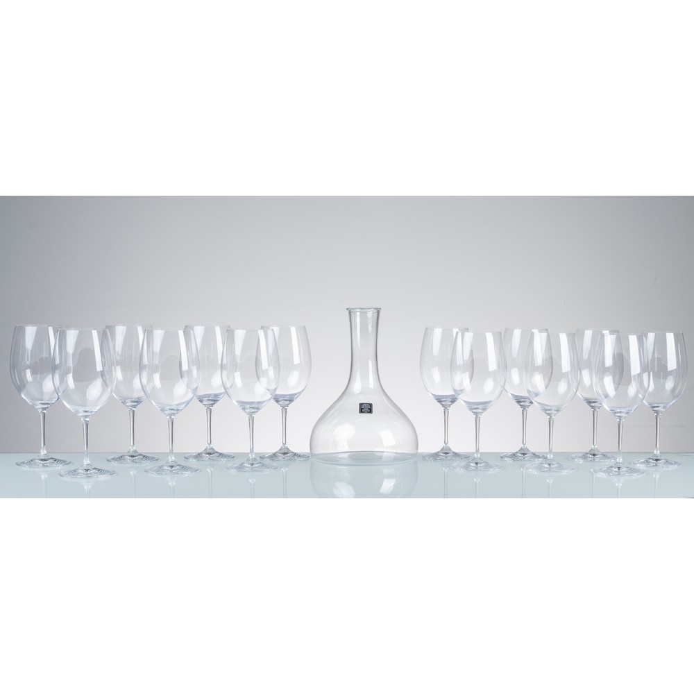 Quattordici bicchieri ed un decanter in cristallo incolore trasparente. Etichetta di produzione.
