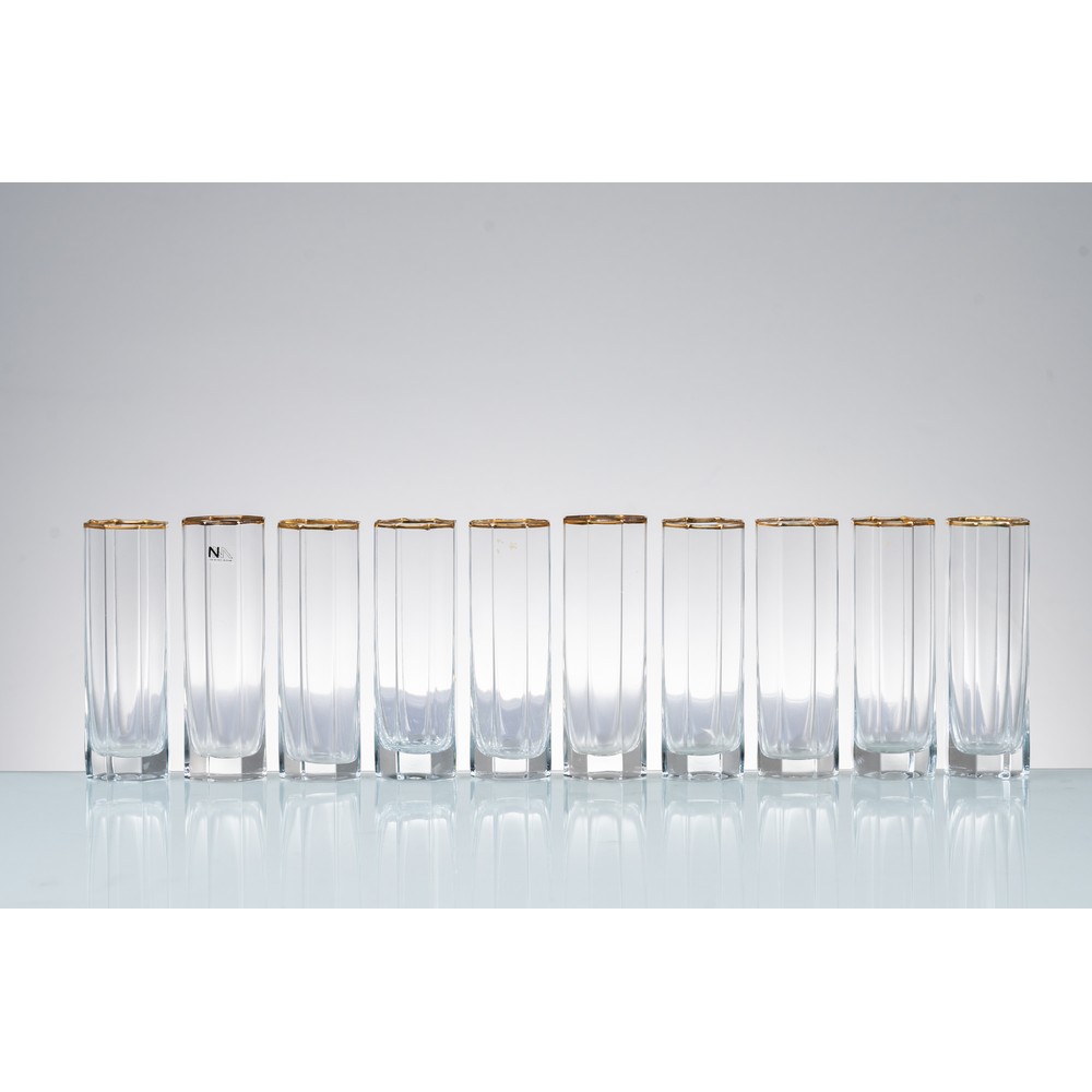 Dieci bicchieri in vetro soffiato incolore, corpo ottagonale, bordo in oro. Un bicchiere con etichetta di produzione.