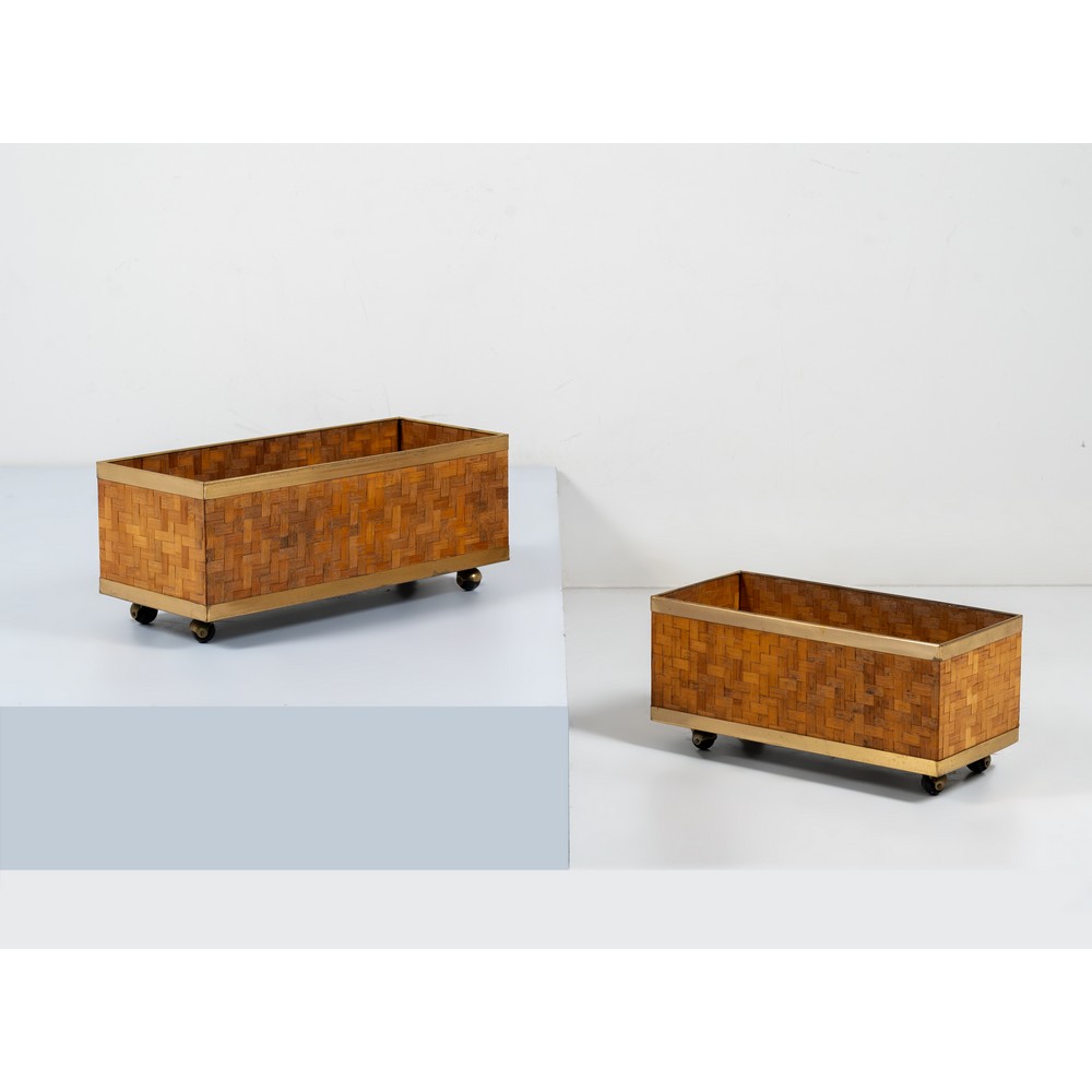 Coppia di fioriere con ruote in bamboo e metallo dorato, corpo a parallelepipedo con decoro ad intreccio. Segni di uso.
