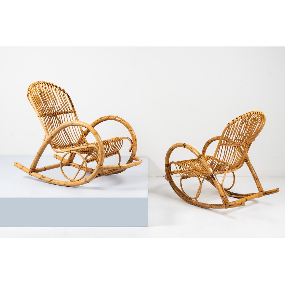 Coppia di sedie a dondolo con struttura in bamboo e giunco.
